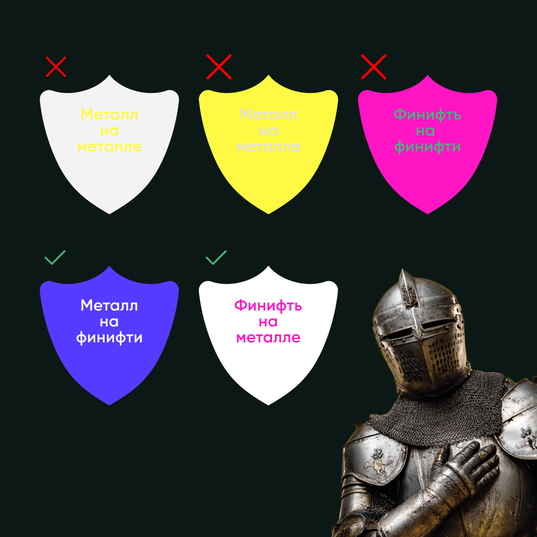 Средневековые “художники-геральдисты” подумали-подумали, и придумали правило тинктур: «Не накладывай финифть на финифть и металл на металл».