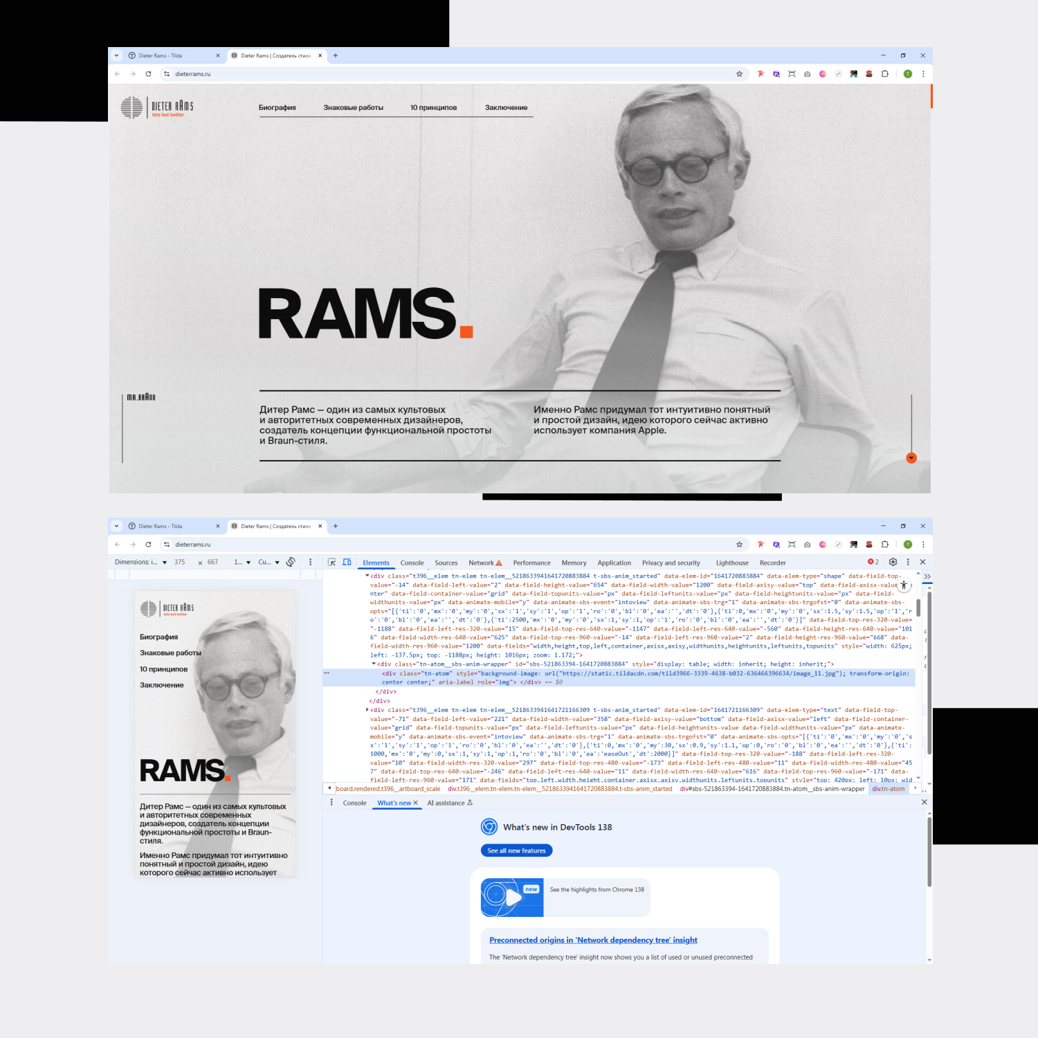 Теперь о самом переносе. У нас есть два подхода. Иногда мы верстаем сайт поблочно, то есть каждый элемент дизайна переносим в Tilda средствами самой платформы, строго следуя согласованному макету. Это кропотливая работа, где мы буквально воссоздаём дизайн с нуля, используя встроенные инструменты Tilda. А иногда поступаем иначе: готовим макет в Figma, подписываем слои, разбиваем его на блоки и используем инструмент Tilda для импорта макета из Figma в Zero Block. Это ускоряет процесс, особенно если макет хорошо структурирован, и помогает точно перенести расположение элементов. В любом случае, Zero Block — наш главный инструмент, когда нужно добиться идеального соответствия макету: он позволяет точно повторить сетку, отступы и расположение элементов. Если же стандартный блок Tilda решает задачу и близок к дизайну, используем его, чтобы не усложнять. Для сложной анимации или интерактива, которых нет в арсенале Tilda, добавляем HTML-блок со сторонним кодом или скриптами, но всегда проверяем, не влияет ли это на скорость загрузки и работоспособность сайта.